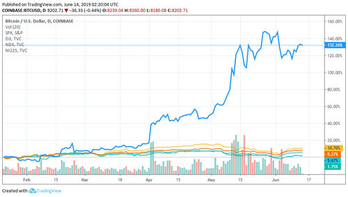 ROI of Bitcoin in blue, compared to de SP500, Dow Jones, Nasdaq and Nikkei