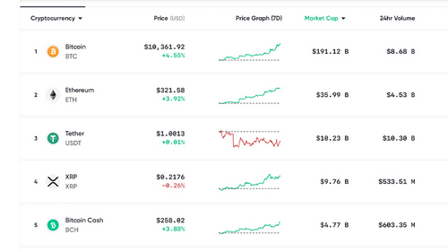 Ethereum (ETH) has gained 3.9% during the last 24 hours. Bitcoin (BTC) is up 4.5% on Monday and is currently trading for $10,361 per BTC. Crypto trade volume is up 55% and the entire market capitalization has gained 7.6% during the last 24 hours.