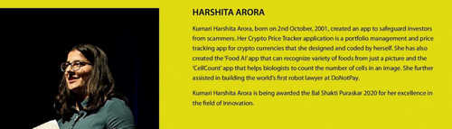 The award recipient, 18-year-old Kumari Harshita Arora, created an app called Crypto Price Tracker, a portfolio management and price tracking tool for cryptocurrencies, which she designed herself.