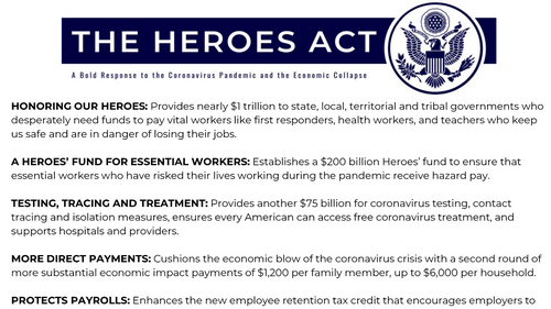 The Heroes Act, unveiled on Tuesday by House Speaker Nancy Pelosi, includes more direct cash payments to Americans of $1,200 per person and up to $6,000 per household.