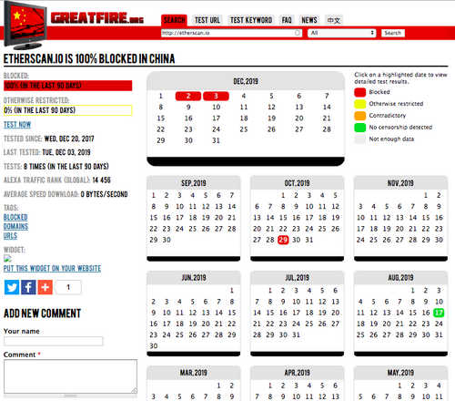 According to data from non-profit monitoring organization GreatFire, China allegedly blocked one of the most popular ETH block browsers, Etherscan, in October 2019. As of Dec. 3, Etherscan’s domain remained inaccessible from IP addresses inside mainland China, as reported by crypto publication Coindesk on Dec. 3.