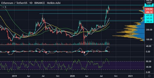 What the Ethereum Chart Says. A quick glance at the Ethereum daily chart reveals that ETH had a hard time breaking the $450 resistance zone as Bitcoin flew past $12k earlier this week.