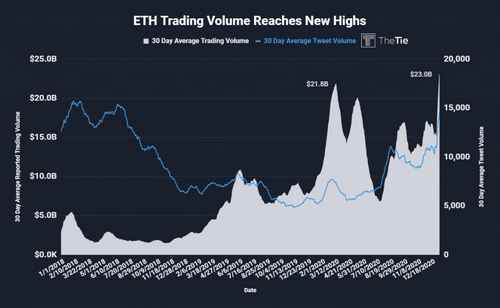 To begin with, Ethereum’s 30-day average daily trading volume has reached a new all-time high of $23 billion. This is according to data from the team at The Tie who shared it via the following chart.