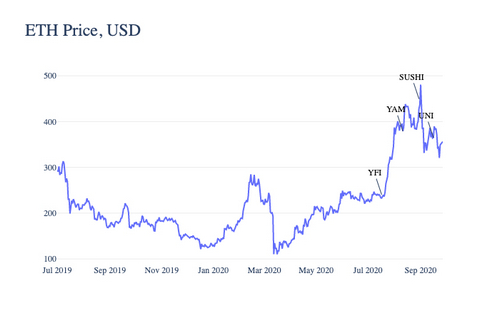 As earlier mentioned, the quick rise of Decentralized Finance projects such as UniSwap (UNI), Yearn Finance (YFI) and more, has caused a similar demand for ETH to power transactions on these protocols. The demand for ETH has had a positive effect on the price of Ethereum.