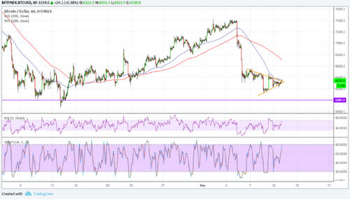 Bitcoin has formed a small symmetrical triangle near its long-term floor. Bitcoin is still hovering above its long-term support near the $6,000 mark and has consolidated inside a short-term symmetrical triangle. A break below the bottom of the triangle could lead to an actual test of the key support area while a break higher could signal that bulls are returning.