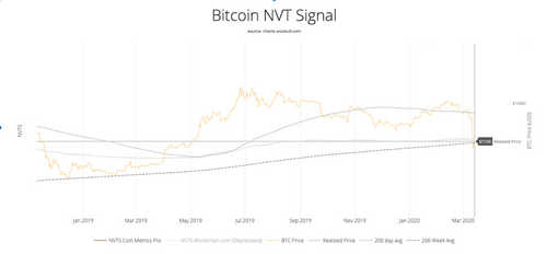 On Sunday, Bitcoin’s price hovers around $5,400, while its realized price on the NTV signal is at $5,596, suggesting the asset is in a purchasing zone after the dump in price on Thursday. Currently, the NTV signal is at 49.5 with 45 representing an oversold scenario.