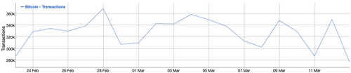 The number of Bitcoin transactions spiked on March 12 as is typical when big swings in the market take place. There was also a spike in the amount of Bitcoin sent in USD on March 13, and the daily number of transactions decreased to late-February levels around 277,000 transactions, maintaining a regular pattern since the start of the year.