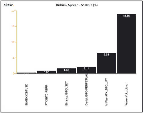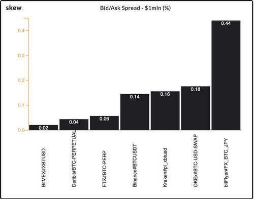 Skew has been tracking the main perpetual swap bid/ask spread for $1 million, $5 million and $10 million. The other exchanges being tracked include Binance, bitFlyer, Deribit, FTX, Huobi, Kraken and OKEx.