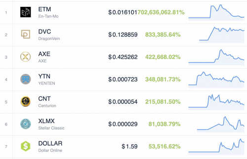 Most of the coins depicted here have no liquidity, and thus their percentage gains are meaningless.