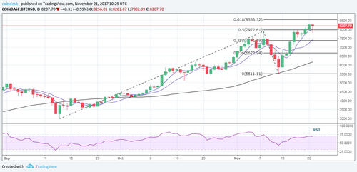 Pullback scenario: A break below $7,800 would add credence to bearish price-RSI divergence (seen on the 4-hour chart) and could yield a drop to 10-day MA seen today at $7,400.