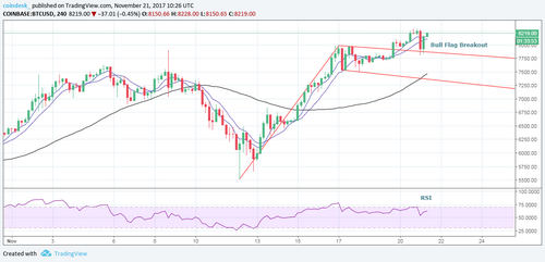 - The sharp recovery from below $7,800 has defended the bullish flag breakout.