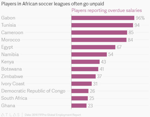 For many soccer players based in Africa, that predicament is all too familiar. In more than half of African countries surveyed in the International Federation of Professional Footballers (FIFPro) 2016 Global Employment Report, over 40% of players reported cases of overdue salaries. In Gabon, with “the highest incidence of delayed pay in the world”, 96% of players surveyed reported being owed salaries.