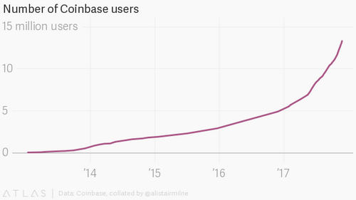 Coinbase, which operates one of the biggest consumer-facing bitcoin wallets and exchanges in the business, added 100,000 users yesterday alone. Over 780,000 new users have signed up so far this month.