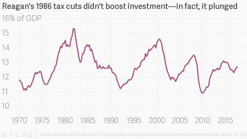 “That’s as large a cut as we’re talking about today, and investment fell-that was the weakest period of investment in the postwar period”, Dean Baker, economist and co-director of the Center for Economic and Policy Research (CEPR), an independent, nonpartisan think tank, tells Quartz. “I’m not going to say that was because we cut the taxes, but it’s a little hard to believe that it will boost investment this time.”