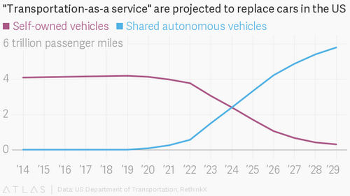 Such car services are a step on the path to a mobility economy allowing people to buy just the amount of transportation services they need on demand. The vision, dubbed the transportation cloud, sees fleets of self-driving electric cars roaming cities and suburbs offering on-demand transportation at rock-bottom prices thanks to low maintenance, cheap fuel costs, and the ability to work around the clock. RethinkX, a Bay Area think tank, predicts (pdf) autonomous electric vehicles could account for 95% of all U.S. passenger miles traveled in the US by 2030.