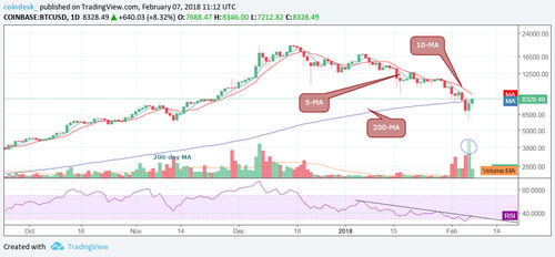 Bitcoin is rallying today, having bottomed out below the $6,000 mark yesterday. As of writing, global average prices on CoinDesk’s Bitcoin Price Index (BPI) are around $8,120. On Coinbase’s GDAX exchange, bitcoin (BTC) moved above $7,944 – the confluence of 200-day moving average (MA) and 5-day MA – earlier today and was last seen changing hands at $8,200