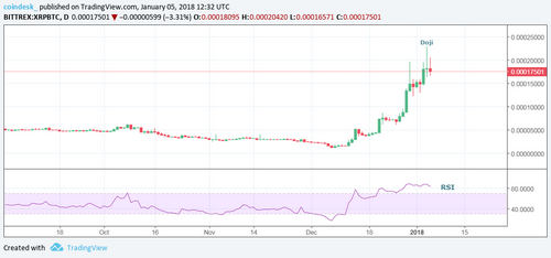 The topping pattern seen on the XRP/BTC chart adds credence to the bearish case put forward by XRP/USD (discussed above) and the rise in bitcoin seen today.