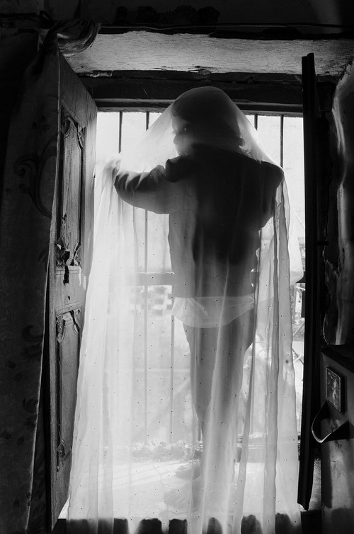 Umrah peeps through a broken window in her house in Deorhi Agha Meer, Old Lucknow. (Taha Ahmad)