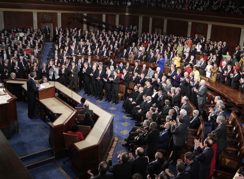 Republican reactions during Barack Obama’s State of the Union speeches were much more muted, according to newswire coverage, with the Republican side often failing to applaud his remarks during the speech. Below, the Republicans are on the left side of the photograph, Obama’s cabinet is standing in the front row, and Democrats are on the right.