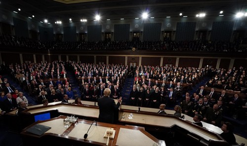 The Congressional Black Caucus and the Democratic women in Congress both wore black for Trump’s State of the Union speech, and rarely applauded during it. They presented a marked contrast to the Republican side of the room, nearly all older white men in suits who leapt to their feet cheering throughout the speech, with a few chanting “USA! USA!” toward the end.