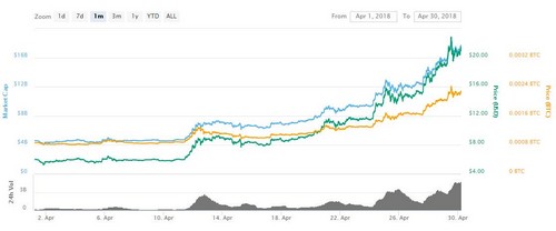 EOS almost scored a double century in April, rising to a new all-time high of $22.89 on April 29, beating the previous record of $18.67 set on Jan. 13. Daily trading volume also surged 915 percent month-on-month in April, adding credence to the rally in prices.
