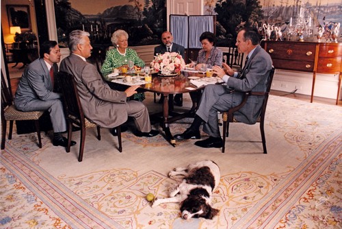 During her years at the White House, Barbara Bush mingled with notable figures of the time, including princess Diana of Wales, Mother Teresa, and, shown here in 1992, president Boris Yeltsin of Russia. (White House via CNP /MediaPunch/IPX/David Valdez)