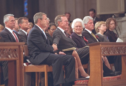 Barbara Bush returned to the White House’s social functions as mother to president George W. Bush. Here she appears at the service for America’s National Day of Prayer and Remembrance in 2001. (White House via CNP/MediaPunch/IPX/Eric Draper)