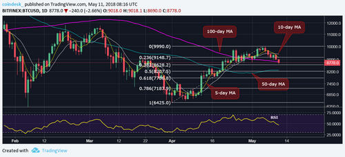 - Bitcoin will likely break below $8,628 (38.2 percent Fibonacci retracement), signaling the end of the rally from the April 1 low of $6,425 and may fall to $8,282 (50-day MA) at the weekend.