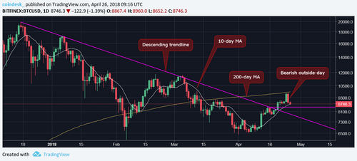 The cryptocurrency hit a one-week low of $8,652 on Bitfinex earlier today and is now trading at $8,700. The 10-percent decline from the weekly high of $9,767 on Wednesday has neutralized the immediate bullish outlook.
