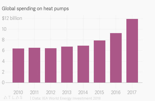 That is now changing slowly. In 2017, global sales of heat pumps jumped by 30%, to nearly $12 billion.