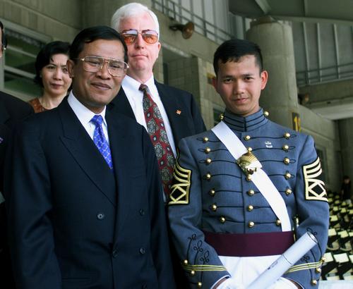 In 1999, Hun Sen stands with his eldest son Hun Manet (right) after graduation ceremonies at the United States Military Academy at West Point.