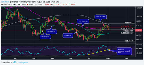 - Bitcoin’s close below the 100-day moving average (MA) on Thursday has confirmed a short-term bullish-to-bearish trend change and opened the doors to $7,130 (50 percent Fibonacci retracement of the rally from the June 24 low of $5,755).