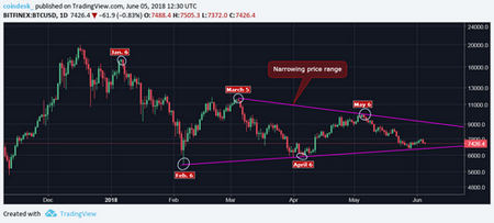 Having topped out in the $20,000 neighborhood in mid-December 2017, the cryptocurrency fell to a 2018 low of $6,000 on Feb. 6. Since then, the cryptocurrency has been restricted to a narrowing price range, as indicated by the triangle pattern in the chart below.