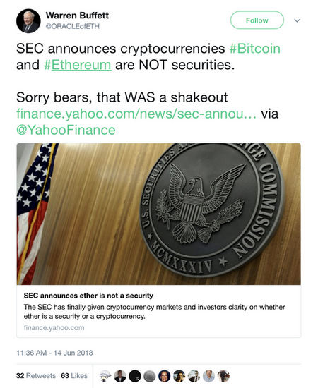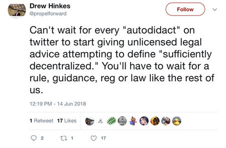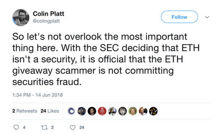 So said William Hinman, director of the division of corporate finance at the U.S. Securities and Exchange Commission (SEC) at a Yahoo! All Markets Summit event in San Francisco yesterday. As you might expect if you’ve been following 2018’s regulatory drama, the online crypto community subsequently exploded with commentary.