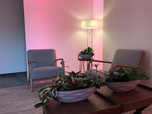 The deceptively soothing antechamber with boat-shaped planters.