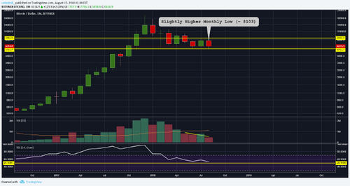 A monthly low slightly higher than the yearly low of $5,755 reveals the bears are becoming exhausted in their attempt to drive down prices with declining volume apparent since the middle of May.