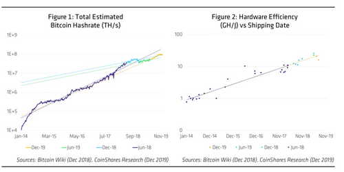 “Since our last report of June 2019, the hashrate has nearly doubled, from approximately 50 EH/s to almost 90 EH/s, having peaked at more than 100 EH/s”, Coinshares’ report details. “During this period the Hashrate grew somewhat slower than the 5-year average — a period which roughly corresponds to the start of the ‘industrial era’ of Bitcoin mining — but significantly faster than both preceding 6-month periods.”