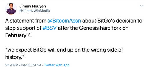 Following the report from Binance Research, another post was published the next day by the Bitgo developer known as Murch in regard to the upcoming BSV chain fork. According to the post, Bitgo is urging BSV users to withdraw BSV from the company’s platform because Pay-to-Script-Hash (P2SH) outputs will soon be invalidated. This is because, on February 4, 2020, BSV is planning to upgrade with the “Genesis Hard Fork”, which plans to remove P2SH. “Since Bitgo’s BSV wallets use P2SH-based multi-signature addresses, the protocol change will render Bitgo BSV wallets unable to receive funds”, Bitgo’s notice detailed.