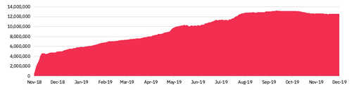 Difference (%) between BSV and BTC reward-to-difficulty ratios (November 15th, 2018 – December 15th, 2019) according to Binance Research.