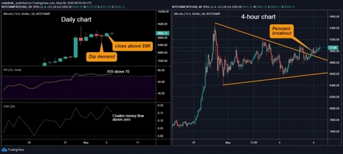 With price charts showing bullish patterns, the overbought reading on the RSI takes a back seat. After all, indicators follow price. As such, one can expect bitcoin to revisit the April 30 high of $9,485. The bullish case would be invalidated if prices drop below Tuesday’s low of $8,760.