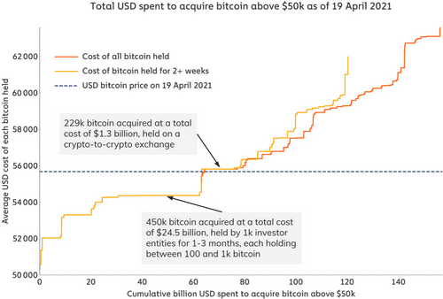 Each of these wealthy investors holds between 100 and 1,000 BTC purchased at least a month ago. The chart published by Gradwell also shows other significant purchases of the «whales», that is, the big players. For example, at a price of $ 55,800, a group of investors bought 229,000 BTC for $ 1.3 billion.