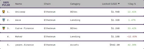 Taking a second look at the rankings at DeFiPulse.com reveals that the total value locked in Uniswap now stands at $1.94 Billion. Furthermore, Uniswap has edged out the DeFi protocols of Aave, Curve Finance, Maker and Yearn Finance. Below is a screenshot of the current rankings.