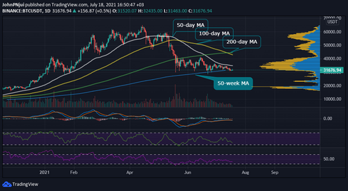 - The 50-week MA is providing support at current levels around $31k