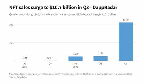 We have updated the latest data: the volume of trading with unique NFT tokens in the third quarter of 2021 set a new record. According to the DappRadar platform, the figure was the equivalent of $ 10.7 billion. At the same time, in the second quarter it was equal to 1.3 billion, and at the end of 2020 it was only 52.8 million dollars. Here is the graph.