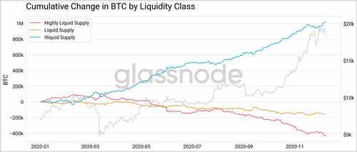 Over the course of 2020, a total of one million additional BTC became illiquid — investors are increasingly unwilling to part with the coins. Because of this, the current bullish trend was (in part) triggered by the new Bitcoin liquidity crisis.