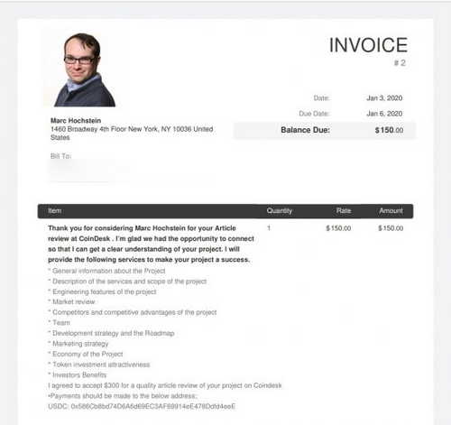 One scammer went so far as to create an invoice for their victim to further lend their offer credibility. CoinDesk is working with our legal counsel and tech team to find ways of thwarting these impostors.