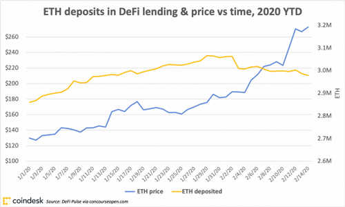 ETH deposits in DeFi lending and price, 2020 year to date (chart)