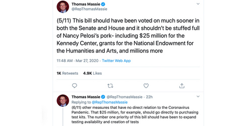 According to Massie, the CARES Act’s official vote had a number of discrepancies and it should not have passed. Massie noted that democratic House speaker Nancy Pelosi also got to add $25 million to fund the Kennedy Center and for the National Endowment for the Humanities and Arts. Massie believes this money could’ve been spent on current healthcare costs like covid-19 test kits and medical equipment. Not only did American leaders ‘pork’ the bill with unneeded funding, Massie also highlighted that the CARES Act takes good care of the Fed. Massie tweeted: