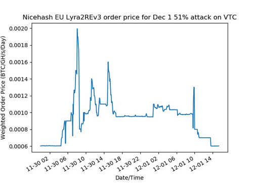 Similarly to last year’s attack, the captured hashrate was blamed on Nicehash. The company sells hashpower to individuals and acts as a hashpower broker marketplace that connects sellers and miners. Lovejoy remarked that he noticed on November 30 “a large upswing in hashrate rental prices for Lyra2rev3 on Nicehash.”