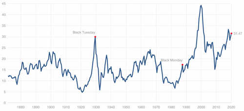 Some interpret the current Shiller PE Ratio to signal a far overvalued stock market, with the ratio climbing back up into dot-com bubble territory.
